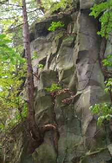 dar, bei denen die Sandpartikel durch abgeschiedene Kieselsäure verkittet worden sind. Nach wenigen Metern erkennt man im Walde und am Wegesrand den Basalt vom Landberg. Wir kommen zum Parkplatz des Gasthauses "Am Landberg" und finden hier am Eingang der Schneise 8 die nächste Tafel.