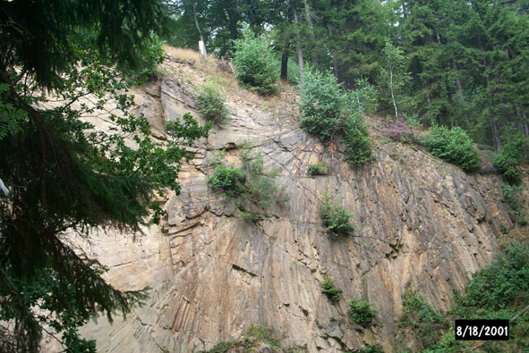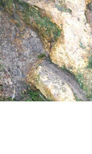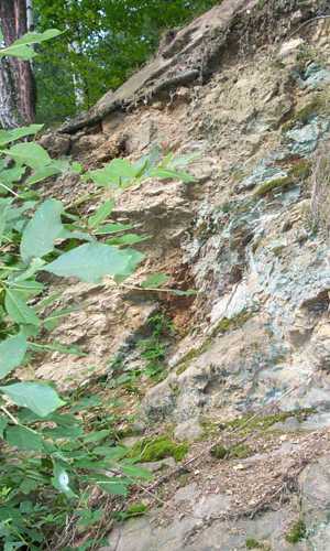 Wenn wir den Weg ca. 100m gegangen sind treffen wir auf die Tafel 2.. Hier ist der am Standort wie überall am rechten Triebischhang anstehende Schiefer beschrieben. Er stellt einen durch Druck und Hitze über 400°C verfestigten Ton dar, der sich an der Grenze zwischen Kambrium und Ordovizium (d. h. im Paläozoikum = Erdaltzeit) aus dem Meer abgesetzt hat (Tr99). Wir biegen nach links in Schmieders Graben ein und finden am linken Hang in Höhe der Mitte des Fußballplatzes ein interessantes geologisches Zeugnis der Bewegung der Erdkruste. Eine Überschiebung des älteren Schiefers über den jüngeren Porphyr.